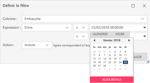 Vous pouvez filtrer les valeurs de date/heure et choisir de ne voir que les enregistrements contenant des valeurs de colonne qui se situent à l’intérieur d’une plage donnée, ou qui se situent avant ou après une valeur de date précise :