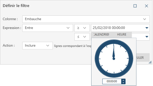 Quand vous créer des filtres de date/heure, vous pouvez spécifier des valeurs de calendrier et/ou de format d’heure. Pour ce faire, cliquez sur les boutons de menu déroulant en regard des champs de date/heure dans la boîte de dialogue Appliquer un filtre de (date/heure), puis cliquez sur Calendrier ou Heure.