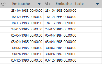 Dans cet exemple, Embauche est la colonne d’origine et Embauche - texte contient les valeurs converties :