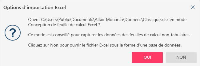Faites glisser la feuille de calcul Excel dans Monarch Data Prep Studio et sélectionnez Oui dans la boîte de dialogue Options d’importation Excel qui apparaît :
