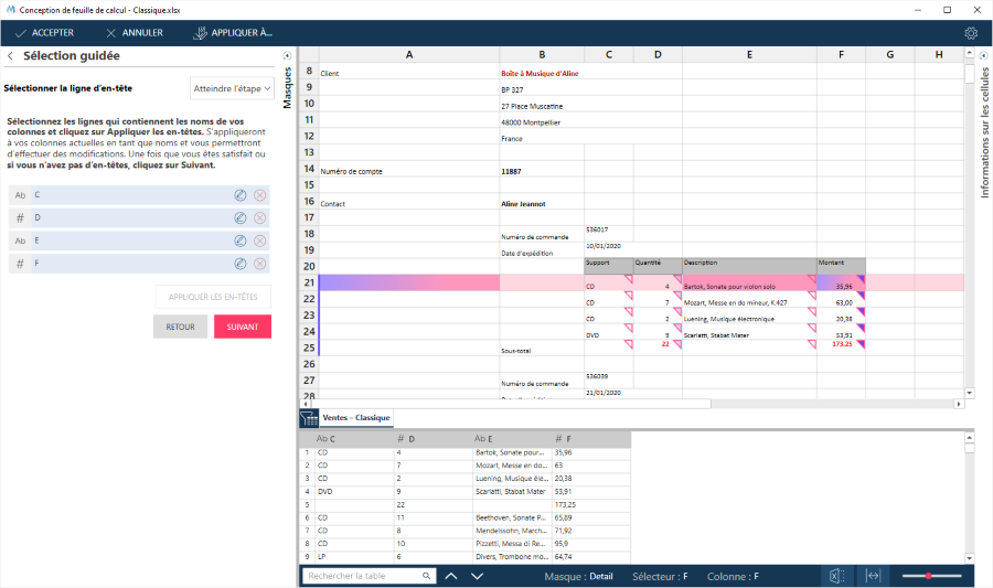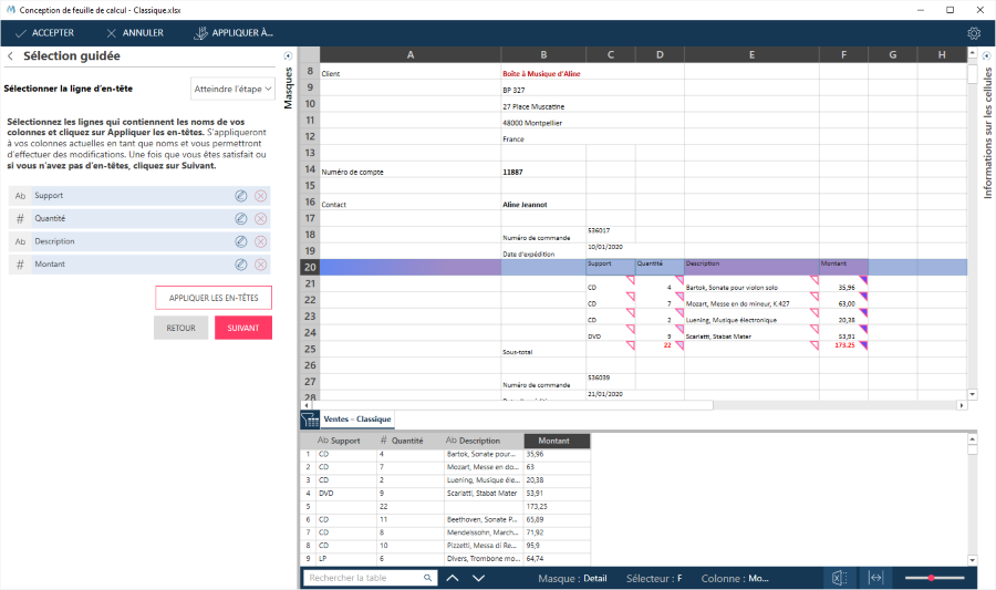 Si vous avez sélectionné des en-têtes, ils sont appliqués. Ils sont reflétés dans l’aperçu, ainsi que dans la liste des sélecteurs :