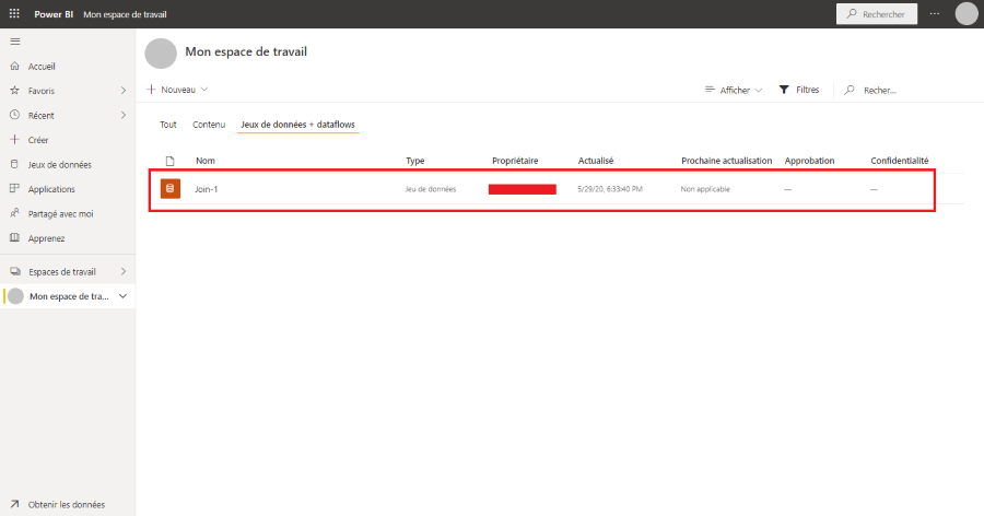 Si vous vous connectez à votre compte Microsoft Power BI et accédez à votre espace de travail, la table exportée devrait apparaître dans la liste Ensembles de données.