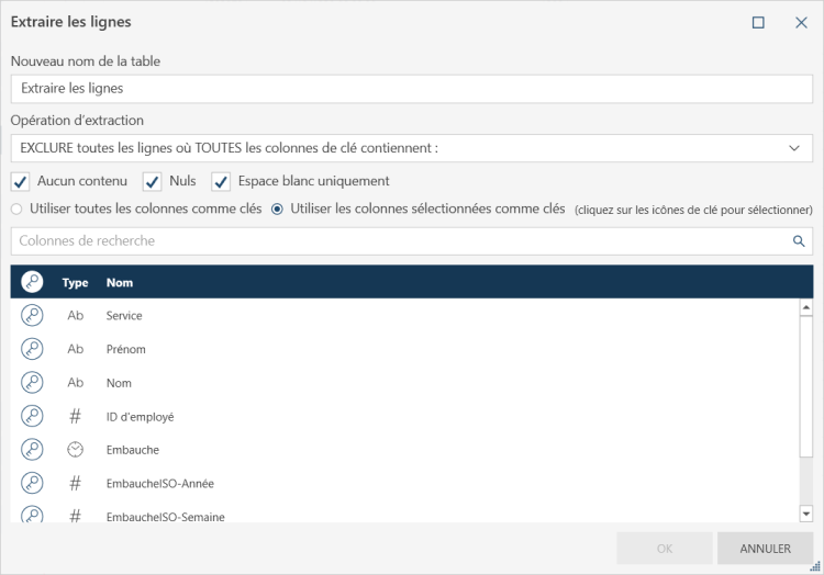 Inclure toutes les lignes où au moins une colonne de clé contient : vous permet d’inclure toutes les lignes où il y a au moins une colonne avec une valeur vide, nulle ou qui contient des espaces.