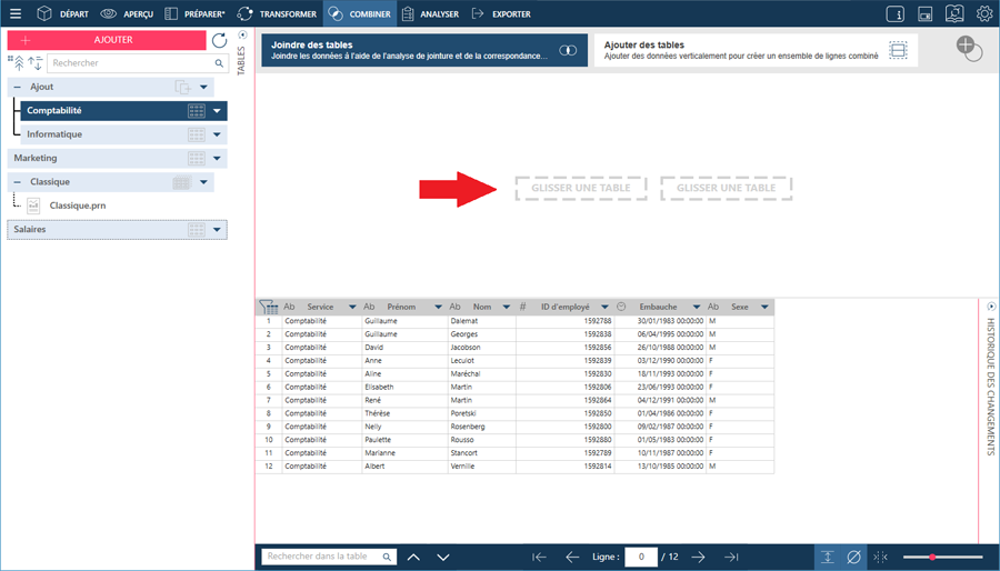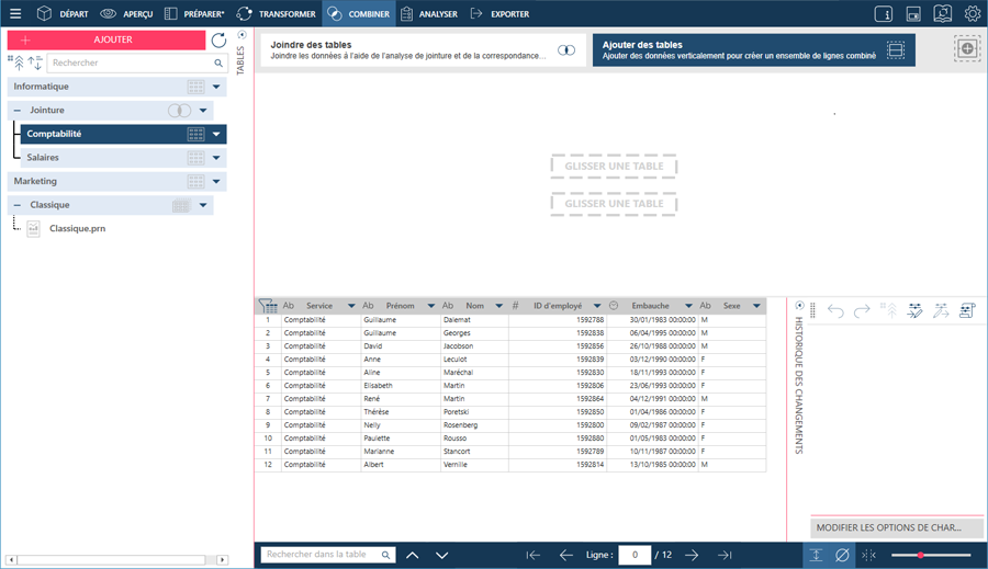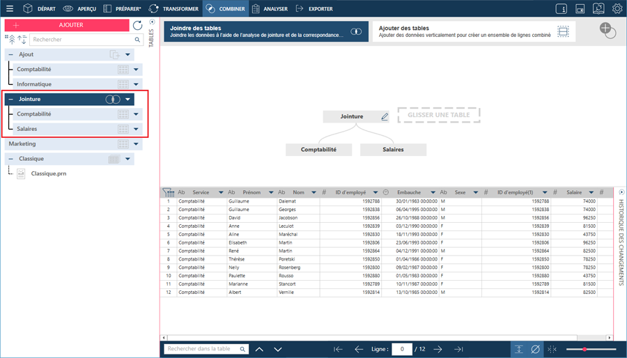 L’étape Combiner vous permet de créer des jointures à partir de deux tables en une seule session de jointure. Si vous souhaitez combiner les enregistrements de deux tables séparées, vous pouvez les joindre pour former une nouvelle table plus complète. Les jointures vous permettent de consolider vos données et d’offrir un affichage plus riche des informations qu’elles contiennent.