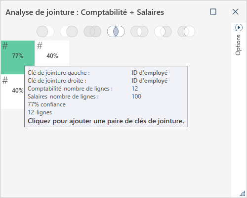 Cette boîte de dialogue indique quels champs produiront les meilleurs résultats (plus la valeur de pourcentage est élevée, plus il y aura de lignes jointes par une combinaison de clés de jointure). Pour déterminer la combinaison de jointure de champ, placez le curseur de votre souris sur une valeur exprimée en pourcentage :