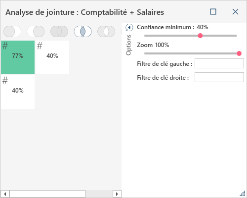 Définir une correspondance minimale : Déplacez le curseur pour contrôler le pourcentage de correspondance qui s’affiche. À titre d’exemple, vous pouvez demander à Monarch Data Prep Studio d’afficher uniquement les correspondances à plus de 95 %. Vous pouvez ensuite cliquer sur les cases qui s’affichent pour visualiser les clés que vous devez joindre pour produire ces correspondances.