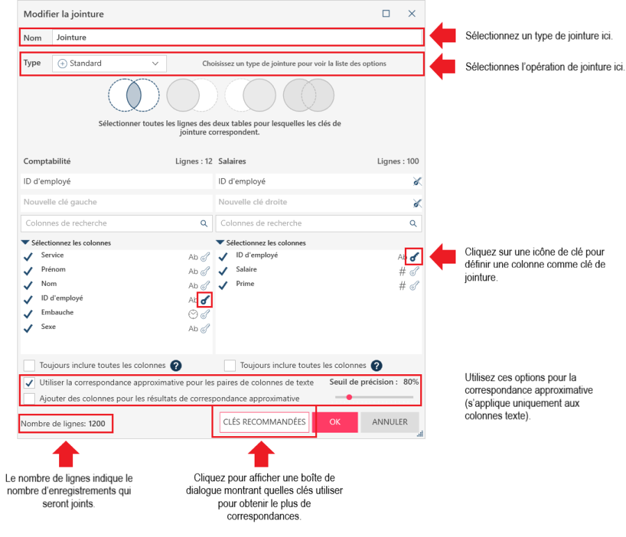 Dans la boîte de dialogue Configuration de la jointure, sélectionnez Clés recommandées.