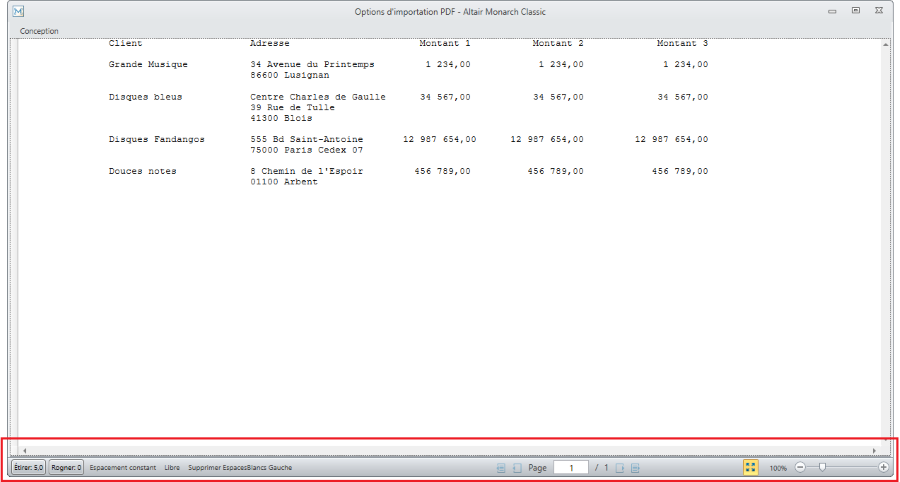 Lors de l’importation d’un fichier PDF ou XPS dans Monarch Classic, cette fenêtre permet d’ajuster les options d’importation PDF ou XPS et de déterminer ainsi la manière dont le fichier PDF ou XPS apparaîtra dans la fenêtre d’état de Monarch Classic (espacement des données, etc.).