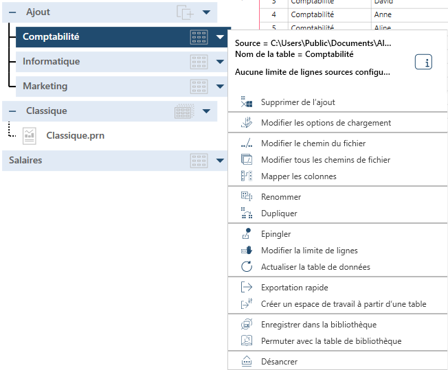 Remarque : Les actions proposées varient en fonction du type de table sélectionné.