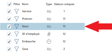 Pour retrouver des erreurs potentielles dans vos données, faites défiler le panneau Information de colonne (panneau numéro 4 du diagramme) à la recherche des colonnes assorties de l’icône d’avertissement :