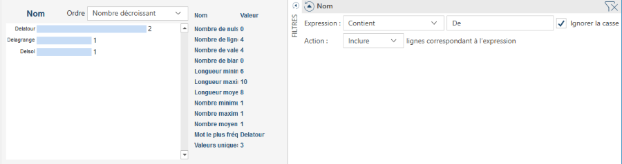 Les informations relatives à la colonne s’affichent sur le panneau Statistiques (panneau numéro 5 du diagramme) :