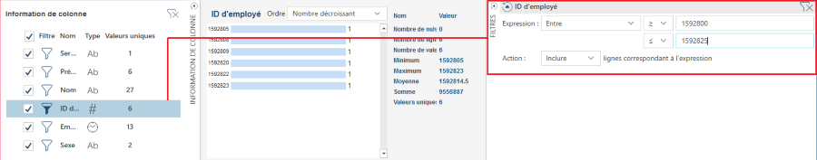 Dans la fenêtre Aperçu, les filtres pour les champs numériques sont créés de la même façon que les filtres pour les champs de texte.