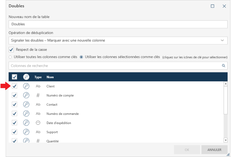 Désélectionnez/sélectionnez les colonnes que vous voulez utiliser pour l’évaluation des doublons.