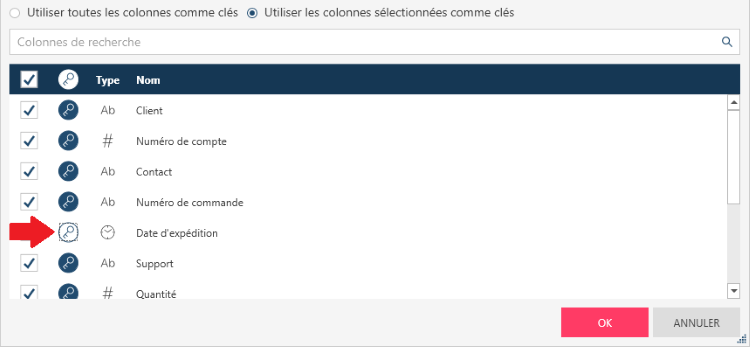 Sélectionnez Utiliser toutes les colonnes comme clés si vous voulez afficher toutes les colonnes.