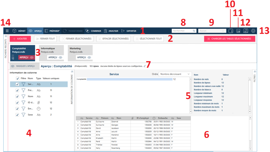 Statistiques de colonne Ce panneau présente les statistiques d'une colonne sélectionnée. Sélectionnez une colonne dans le panneau Information de colonne (4 dans l’illustration de la fenêtre Aperçu ci-dessus) pour afficher diverses statistiques en fonction du type de données. Pour les colonnes de texte, les statistiques suivantes s’affichent :
