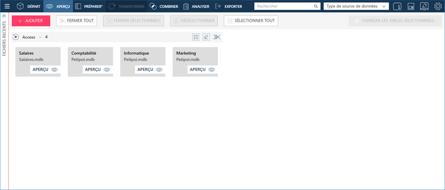 La fenêtre Aperçu affiche initialement une liste de tables des sources que vous avez ouvertes :