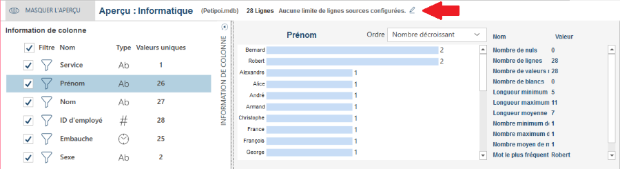 Nombre de lignes et limite de lignes Affiche le nombre de lignes de la source de données. Vous pouvez limiter le nombre de lignes à exploiter en cliquant sur l’icône Modifier