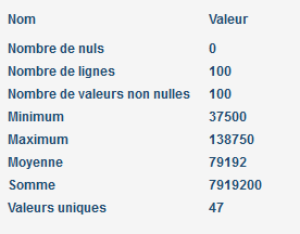 Pour les colonnes numériques, les statistiques suivantes s’affichent :