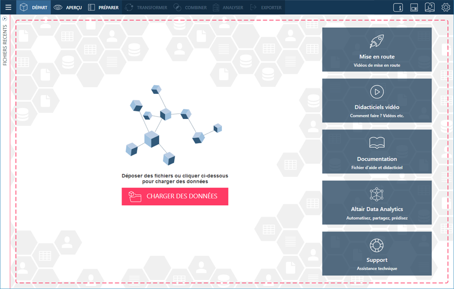 La page Départ s’affiche au démarrage de l’application Data Prep Studio ou quand vous sélectionnez Départ dans la Monarch Data Prep Studio .