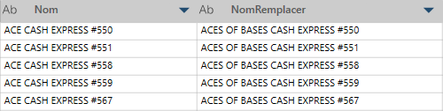 Dans cet exemple, la première colonne (Nom) est la colonne d'origine. La deuxième colonne affiche les valeurs obtenues lorsque l'opération d'remplacer est terminée.
