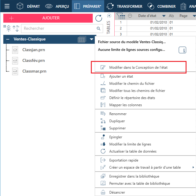 Vous pouvez préparer, transformer et combiner les données uniquement si vous sélectionnez la table principale. Vous ne pouvez que visualiser les données si vous sélectionnez un état (sans préparation, transformation ni combinaison admise).
