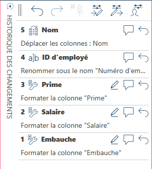 appliquer vos changements à d’autres colonnes d’autres tables de la fenêtre Préparer. Vous pouvez même exporter l’Historique des changements et l’appliquer à d’autres tables dans un autre espace de travail ;