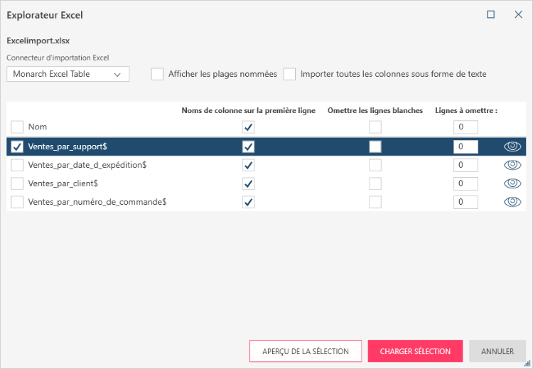 Pour appliquer ces spécifications, sélectionnez le nom d’une table à ouvrir dans la colonne la plus à gauche de la boîte de dialogue Si vous désirez ouvrir toutes les tables comprises dans le fichier Excel cochez la case Nom de la table. Vous pouvez alors cocher les cases correspondant à chacune des options décrites ci-dessous par table. Cliquez sur l’icône d’aperçu à droite de chaque nom de table pour voir un aperçu de la table qui sera chargée.