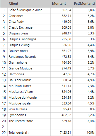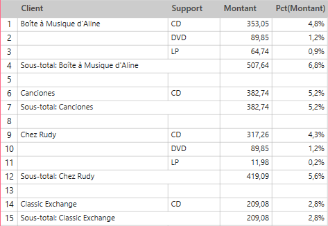 Les lignes de sous-totaux s’ajoutent lorsque la valeur du champ-clé change. Dans l’illustration ci-dessous, les lignes de sous-totaux s’ajoutent chaque fois que la valeur du champ-clé Client change.