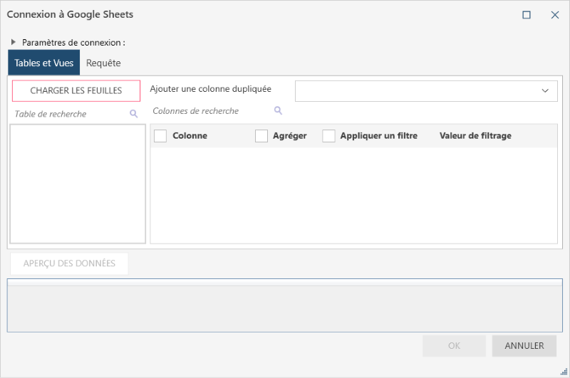 Entrez les valeurs de connexion dans la boîte de dialogue pour récupérer des données de votre source Google Sheets.