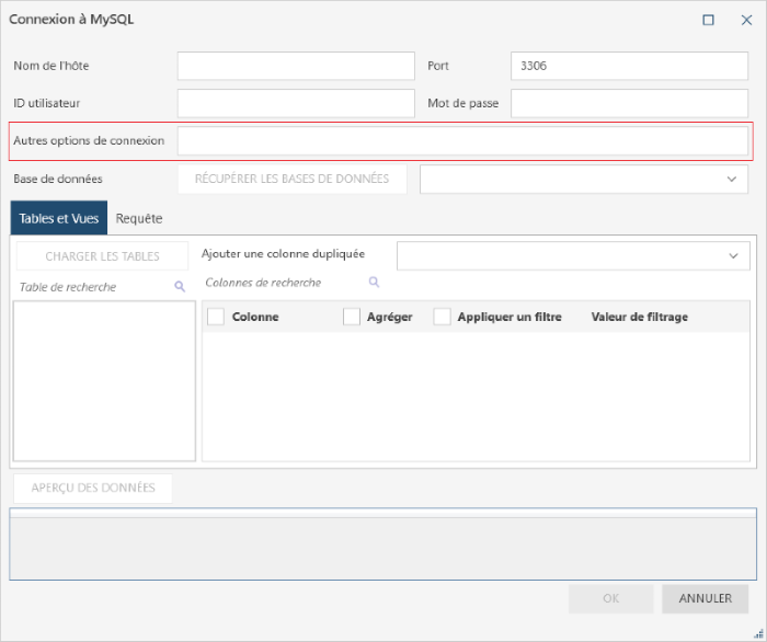 La plupart des boîtes de dialogue de connexion de Monarch Data Prep Studio incluent un champ de texte dans lequel vous pouvez saisir des options de connecteur supplémentaires :