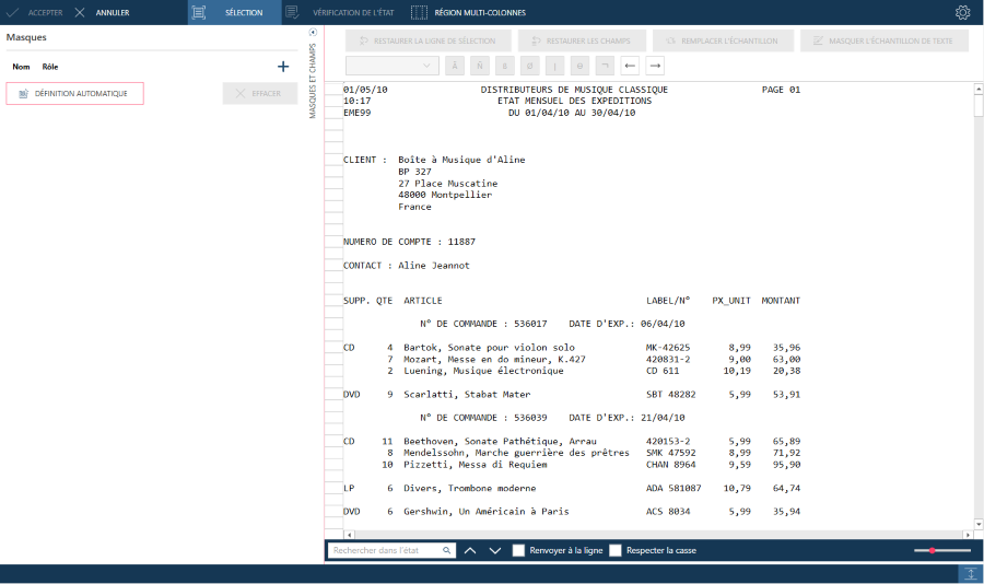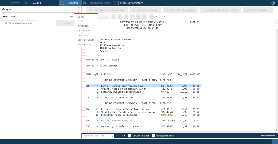 Dans certains états, les champs de détail sont présentés sur plusieurs lignes, par ex. un bloc de texte. Il peut aussi y avoir occasionnellement des caractéristiques uniques qui identifient la première ligne d’un bloc de texte. S’il est impossible d’utiliser cette première ligne, sélectionnez une autre ligne, dotée de caractéristiques uniques. Vous devez dans ce cas indiquer la ligne d’échantillon sur laquelle opérer la sélection via le champ Ligne de sélection.