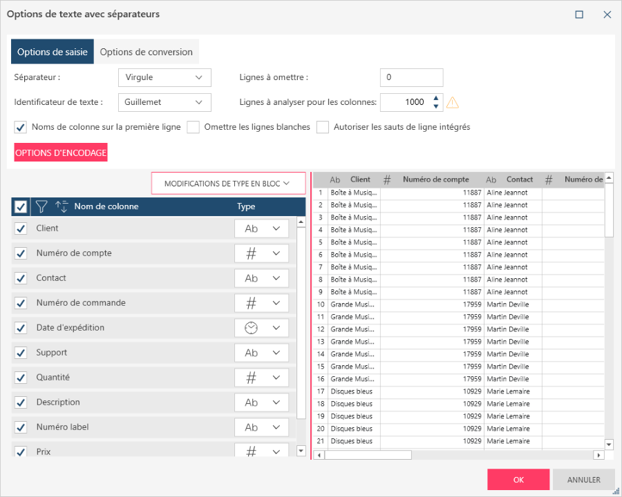 La boîte de dialogue Options de texte avec séparateurs vous permet aussi de spécifier un type de données pour chacun des champs de votre source de données CSV en utilisant les listes déroulantes Type sur la droite de chaque colonne. Vous pouvez aussi spécifier un seul (« en bloc ») type de données à appliquer à tous les champs de votre source de données via la liste déroulante Modifications de type en bloc.