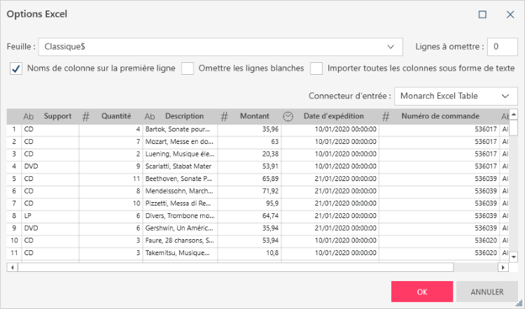 Dans le cas d’une source de données Excel, la boîte de dialogue suivante s’affiche :