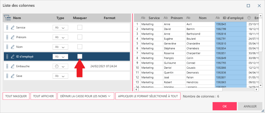Cochez la case Masquer en regard de la colonne que vous voulez masquer.