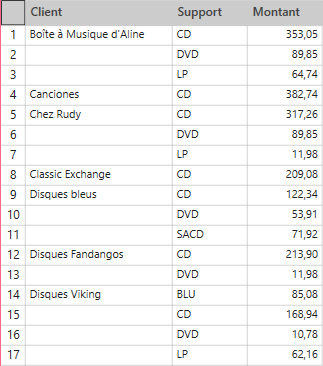 La réduction ou le développement permet d’explorer rapidement un groupe de données du récapitulatif. En réduisant, vous pouvez diminuer le niveau de détail dans le récapitulatif et révéler ainsi des informations de plus haut niveau. Par exemple, le récapitulatif suivant détaille les ventes selon le type de support dans le champ Client. Le total des ventes est affiché pour chaque type de support dans chaque champ Client. En réduisant le récapitulatif, Monarch Data Prep Studio groupe les totaux de ventes pour chaque type de support afin d’afficher un seul total des ventes pour chaque client.