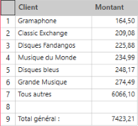 Cette option ne renvoie que les valeurs de champ-clé pour lesquelles le sous-total d'une mesure sélectionnée est inférieur ou supérieur à une limite spécifiée. Cette option permet par exemple de limiter l’affichage aux clients dont les ventes s’élèvent à plus de 88 000 €.