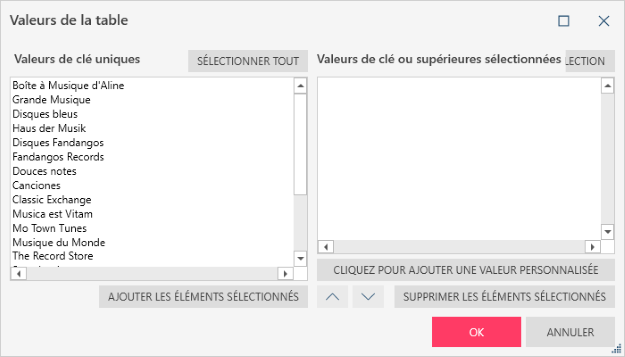 Sélectionnez une valeur ou toutes les valeurs dans le panneau Valeurs de clé uniques, puis cliquez sur Ajouter les éléments sélectionnés.
