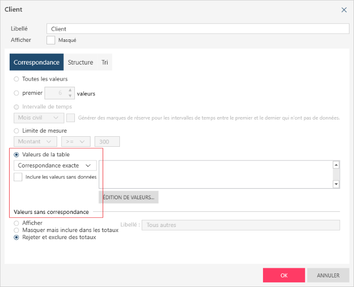 Si vous avez sélectionné l’option Valeurs du tableau, cliquez sur le bouton Édition des valeurs pour afficher Valeurs du tableau :