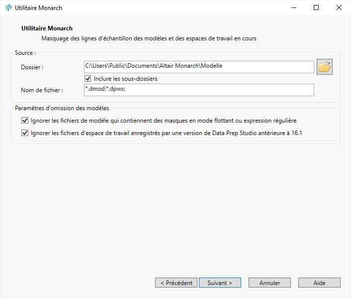 Sur l’écran suivant, entrez le chemin du dossier source où se trouvent les modèles et les espaces de travail utilisant les masques contenant les lignes d’échantillon que vous voulez masquer. Au besoin, cliquez sur le bouton Parcourir