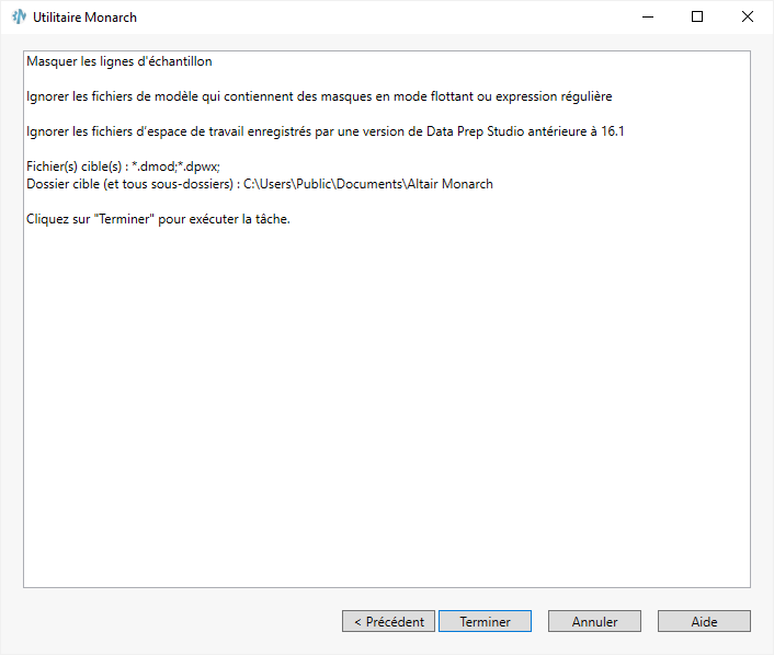 Sélectionnez Terminer pour masquer les lignes d’échantillon dans les modèles et espaces de travail spécifiés si l’opération indiquée est correcte. Pour modifier l’opération de masquage, cliquez sur Précédent.