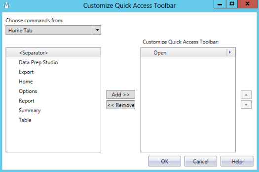 Select a command or tool and click Add>>. The command or tool will be moved from the selector to the Customize Quick Access Toolbar list on the right.