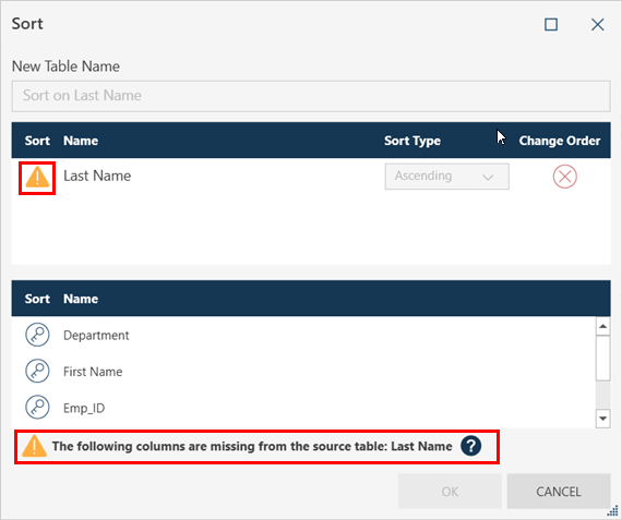 In this case, Monarch Data Prep Studio will display a warning before the transformed table when the data is refreshed. When you edit the transform, warnings are also displayed before the problematic column. In some cases messages are displayed to help you fix the issue: