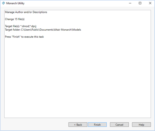 Launch the Monarch Utility wizard and ensure that the button for Manage authors and descriptions in binary models or projects is selected. Click Next when you are finished.