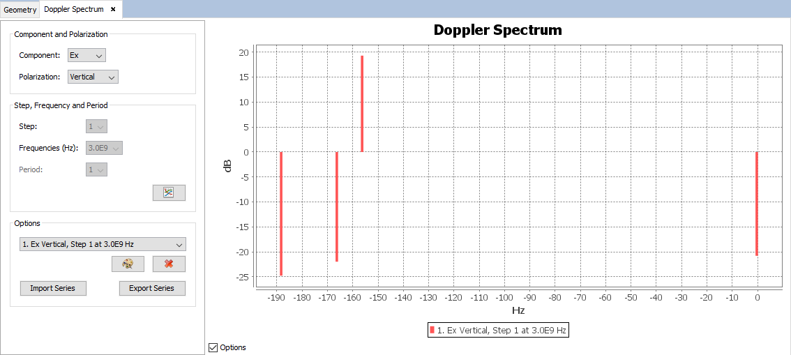 To plot a graph, the user can select the field component, the polarization, the step, the carrier frequency and the Doppler Period (). A new graph will be plotted with the button ' Add Series'. In the case that the user has set up a parametrized geometry (see GUI for details), it is possible to select the step to visualize the results for.