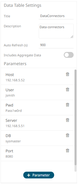 1. On the Parameters pane of the Data Table Settings, define the connection settings you will use for the connector. Such as the following: