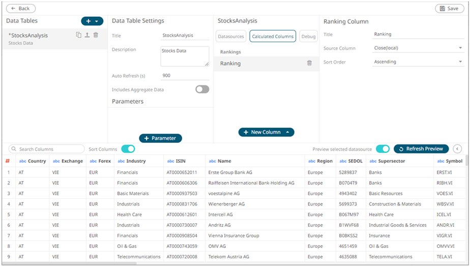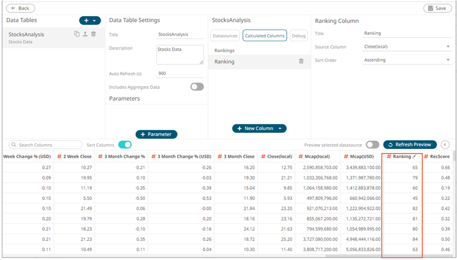 The Ranking Column pane displays which lets you create new numeric columns based on ranking other columns in your data source. The rank is calculated for each row across each time period.