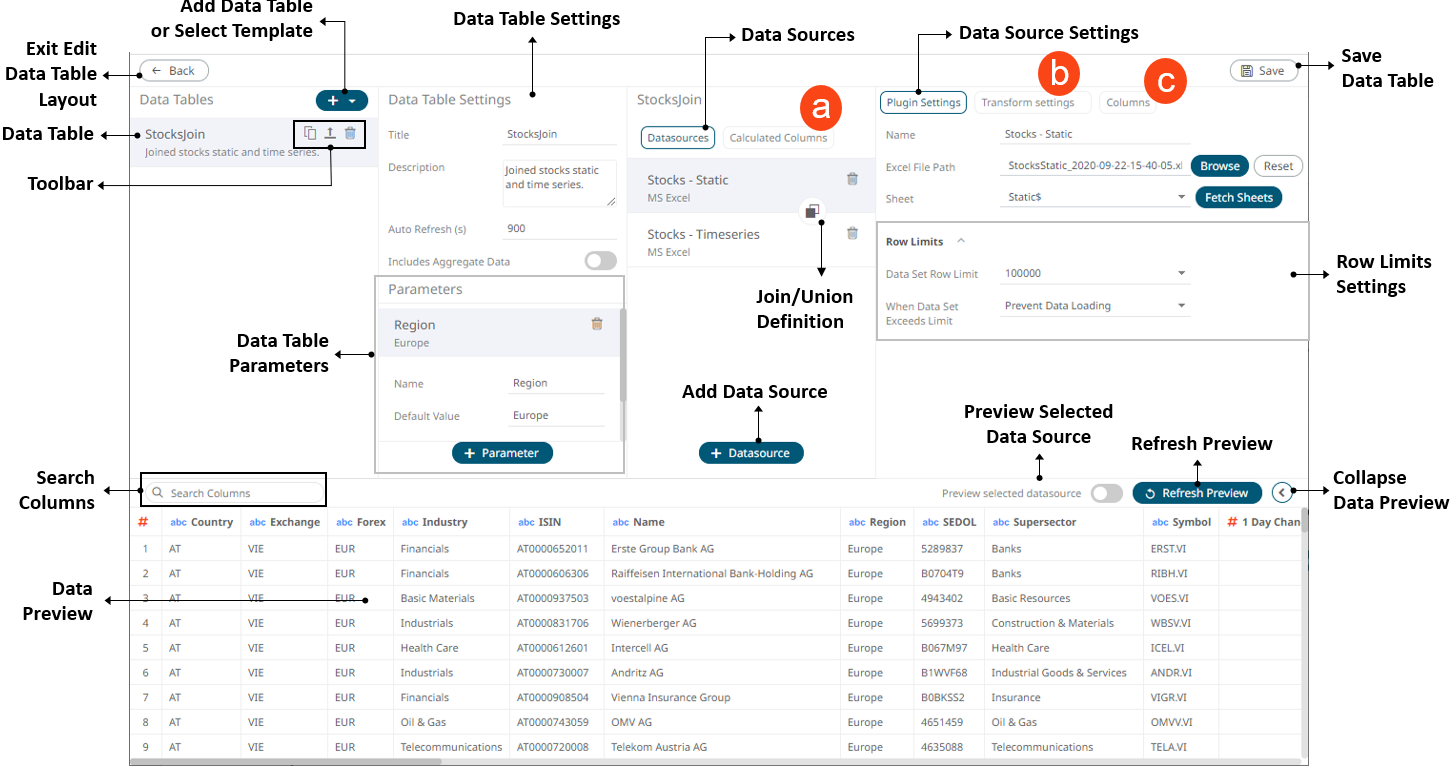 Displays the data source settings and allows for limiting the amount of data to be returned. |