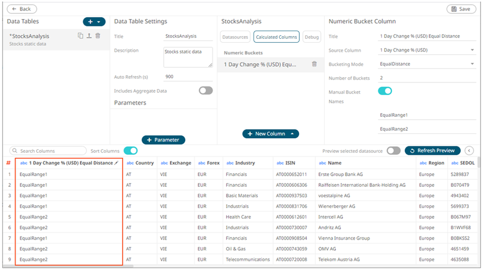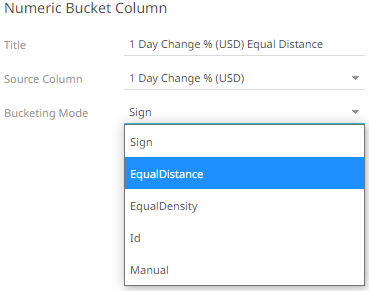For example, for the 1 Day Change %(USD) column, the minimum value is -0.35 and the maximum value is 0.21 when you specify 2 buckets, the equal distance ranges will be the following: