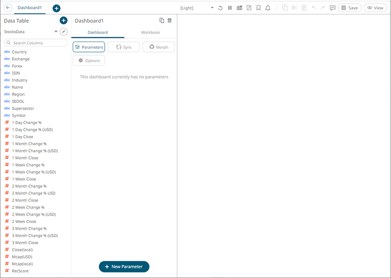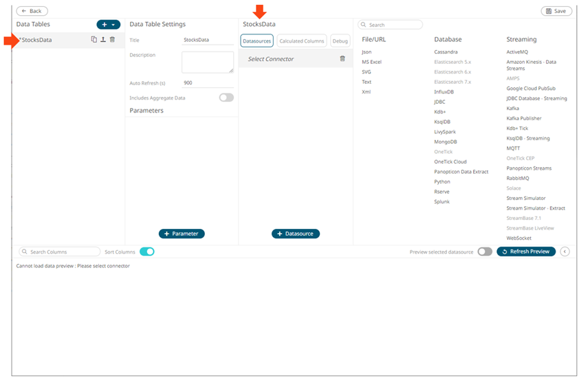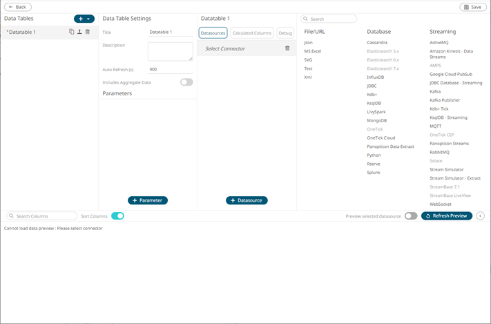 You must select the data table you want to use in a Panopticon workbook. The data table definition can be unique to a single workbook. You can also save the data table definition locally for other users or publish the data table template.
