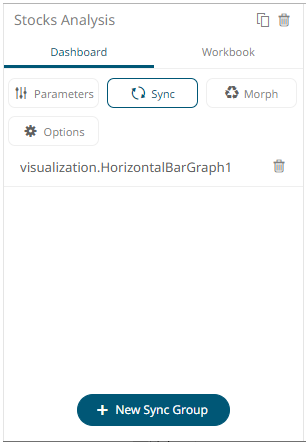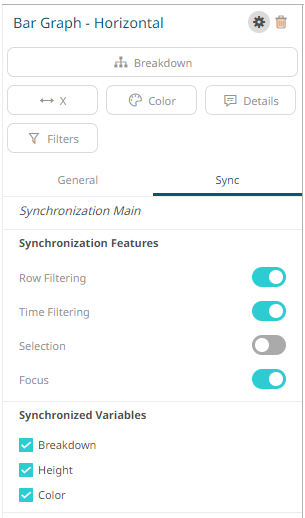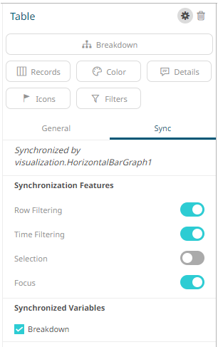 For the child visualizations, the main visualization to which it will be synchronized into is indicated as well. For example “Synchronized by visualization.HorizontalBarGraph1”.